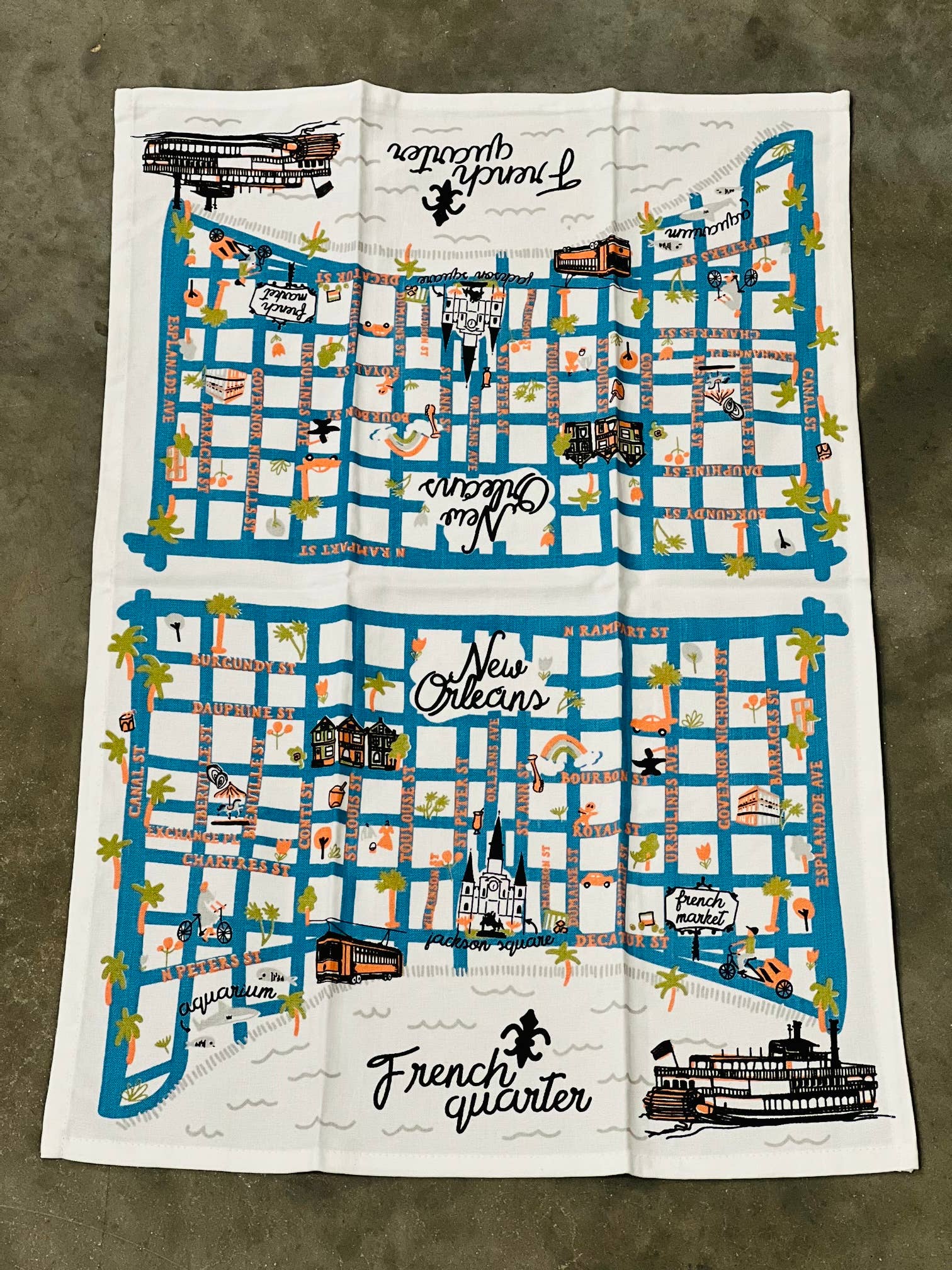 Bring New Orleans charm to your home with the French Quarter Map Kitchen Towel. Featuring colorful artwork of the Mississippi River, St. Louis Cathedral, and French Market, this 100% cotton towel measures 26” by 17” and includes a hidden loop for easy hanging and display.