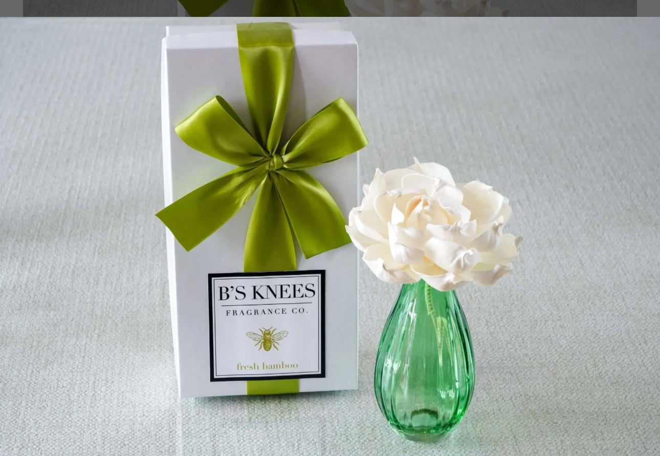 Crisp fresh green bamboo combined with flowering citrus blossom with notes of hyacinth, lilac & jasmine and hints of musky rose. Boxed with double satin ribbon! Voila! Ready to be given as a gift or ready to be received! Madie in the USA