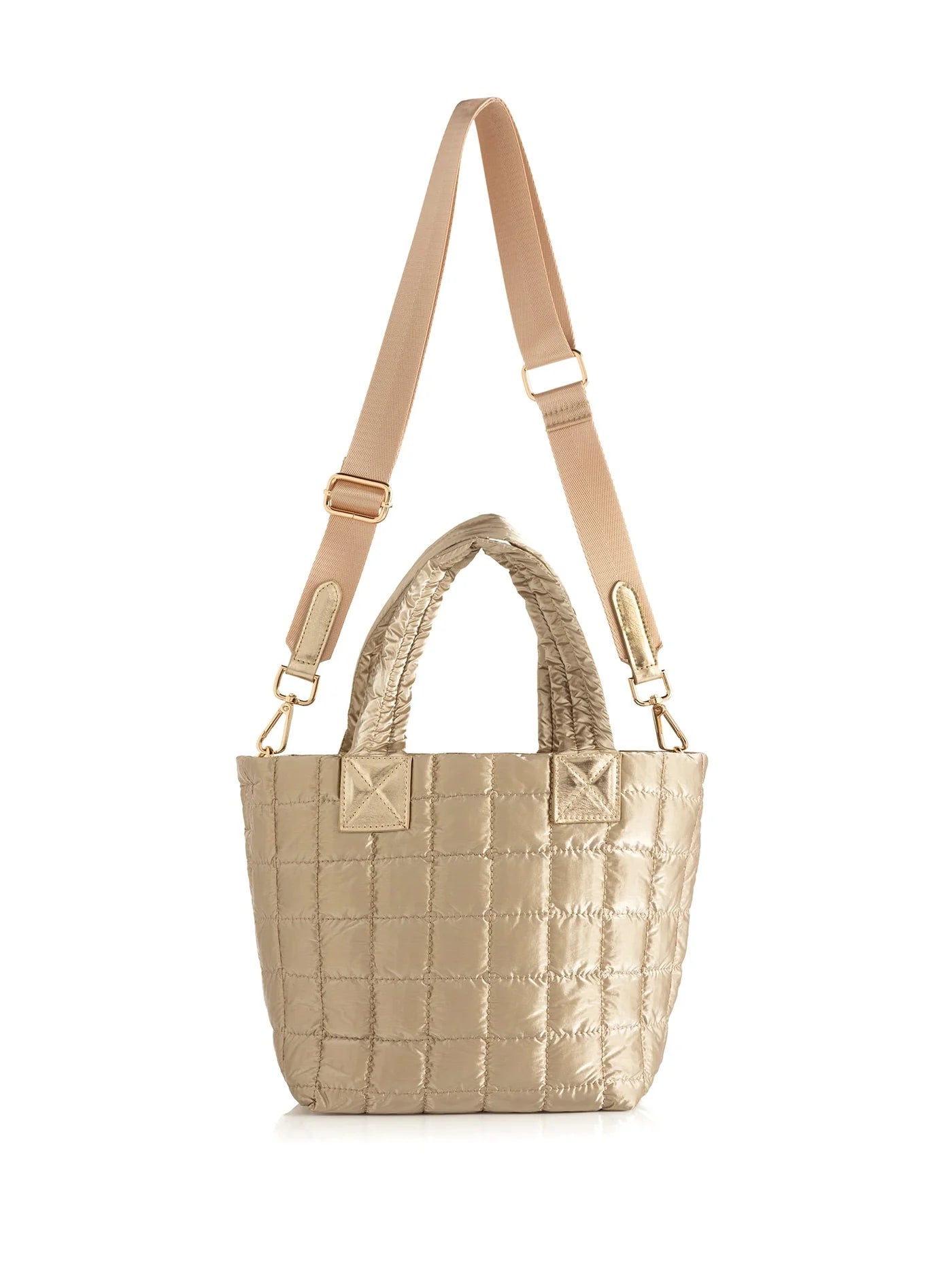 The Logan Mini Crossbody Bag is the chic, versatile sidekick you didn’t know you needed. Made from shiny quilted nylon, it features top handles for a classic touch and a detachable crossbody strap for hands-free ease. Available in metallic gold, rose, and pearl, it adds the perfect pop of shine to any outfit. Compact yet spacious, it fits your essentials with room to spare. Measures 14” by 6” by 9” with a 6” handle drop and a 28” adjustable strap.