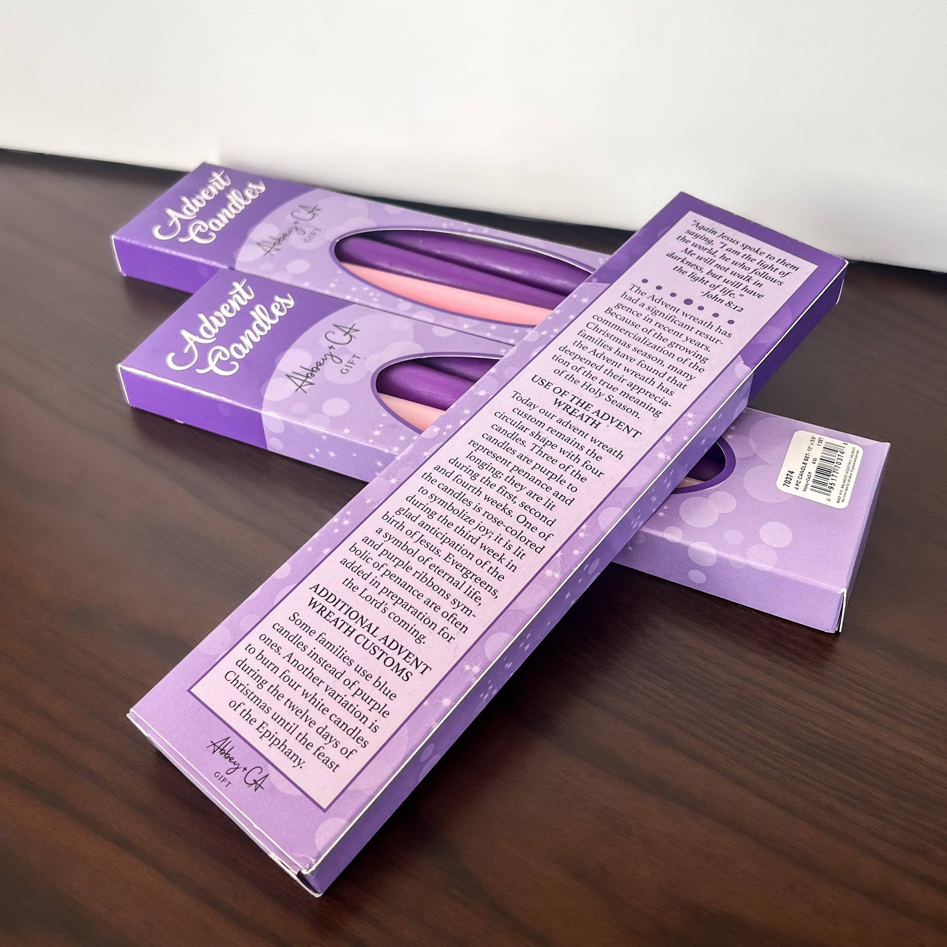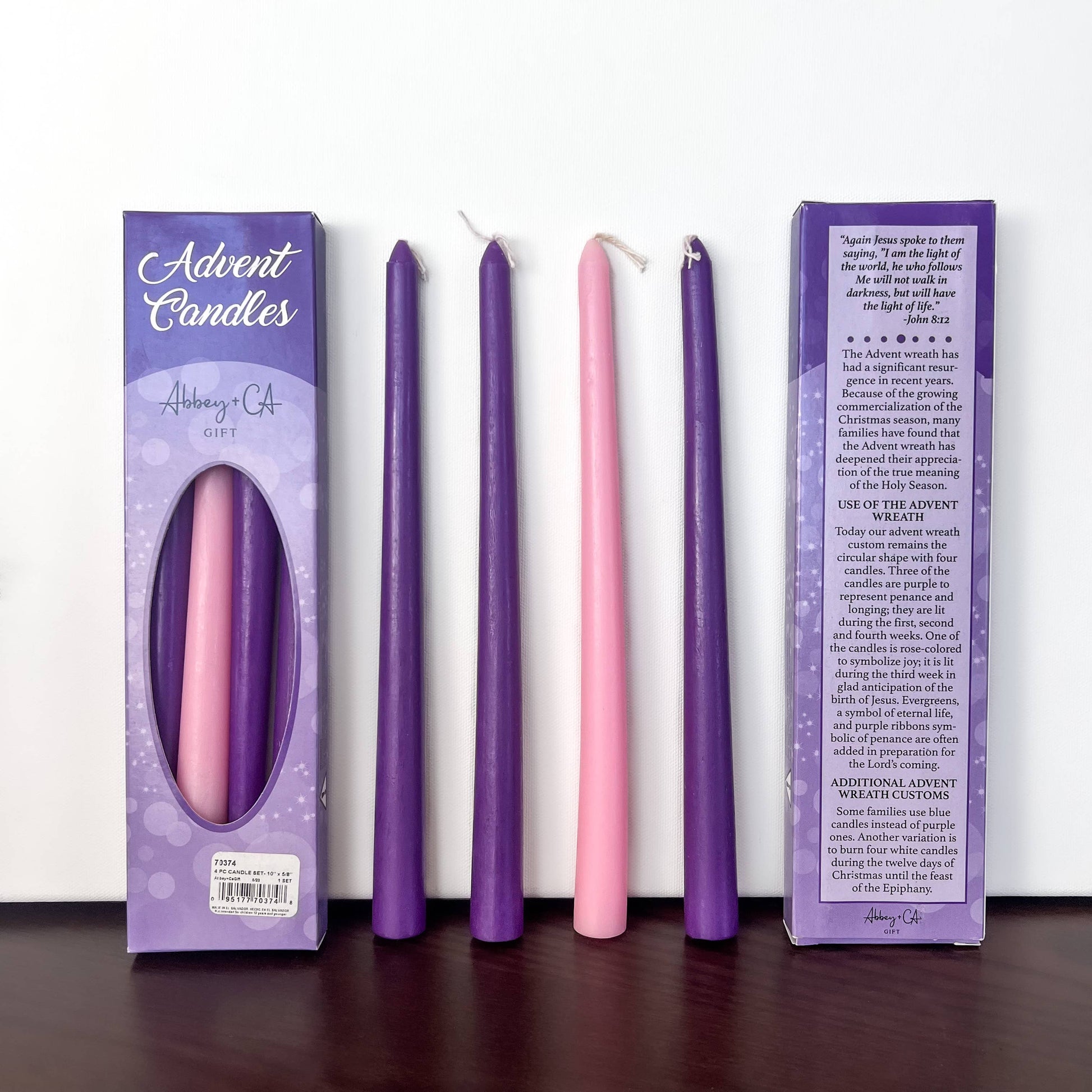 Replacement candles for advent wreaths - 4 pc candle set- 10" x 3/4" 3 purple & 1 pink, boxed.