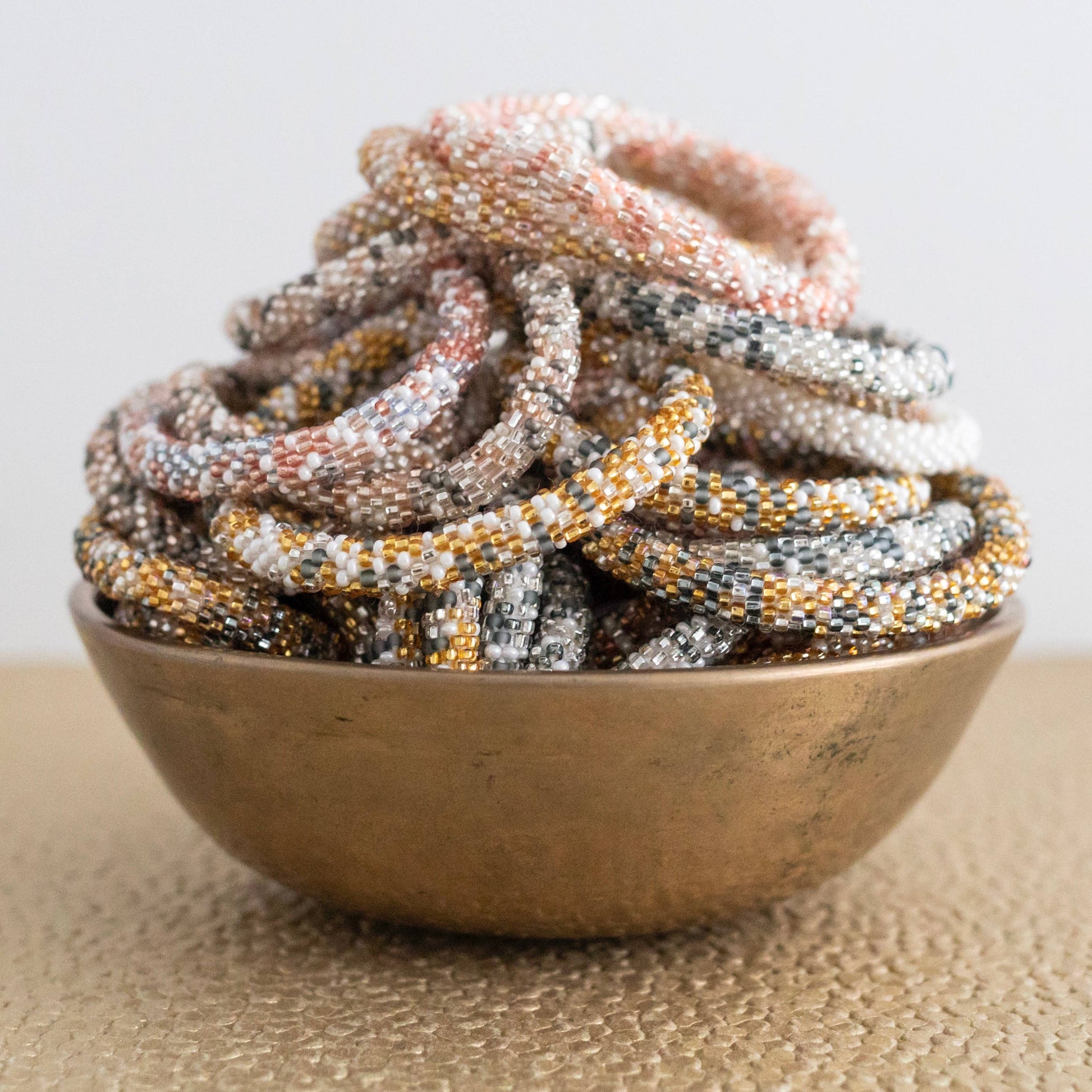 Our Neutral Roll-On® Bracelets are the perfect, versatile set for any look! This party pack includes a wide variety of our speckled bracelets. The colors of this 7" handmade bracelet set range from whites and greys to soft pink and tans. Colors and designs vary, your bracelet will be randomly selected, making every purchase a fun surprise. Sold individually.